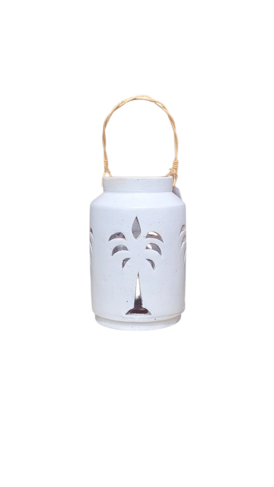 Een prachtige boho-lantaarn van cement met opvallende palmbladeren. Het handvat is van rotan.