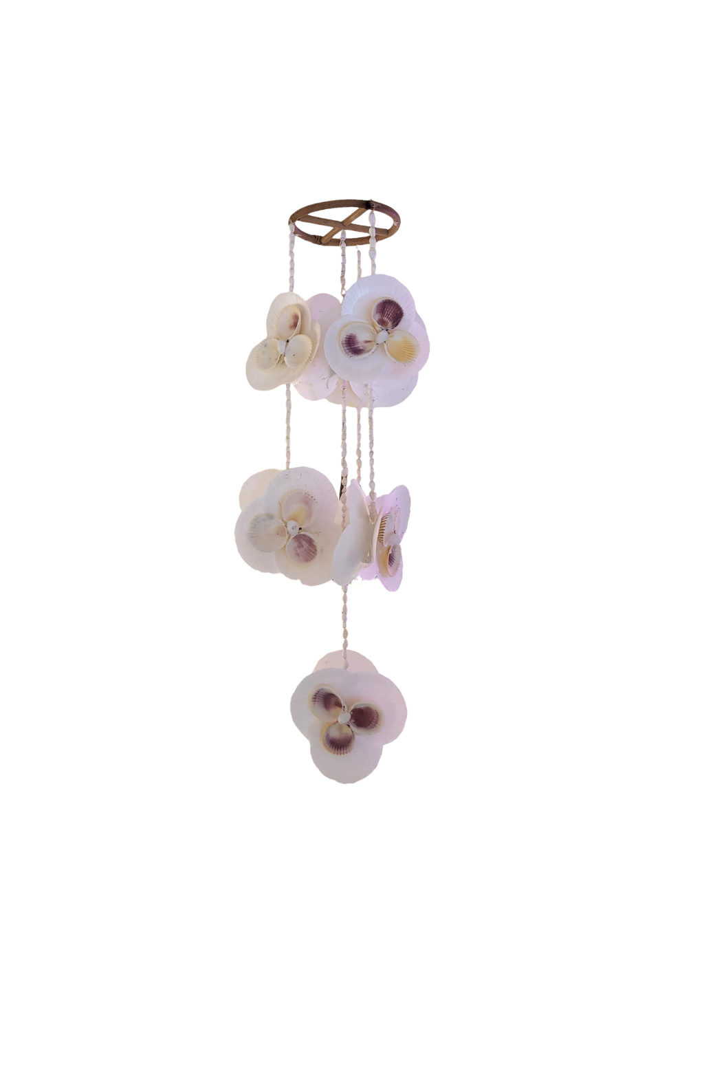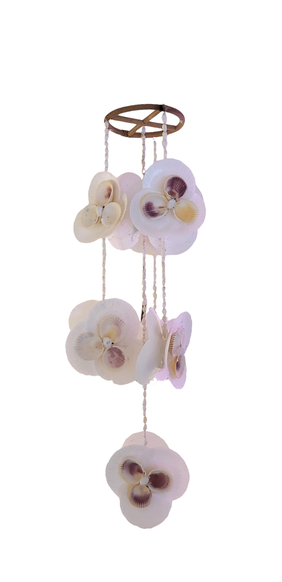 Dit is een prachtige handgemaakte hanger van schelpen in vorm van orchideeën! Het is een uniek stuk wat prachtig in een kinderkamer, huiskamer of patio kan worden gehangen.